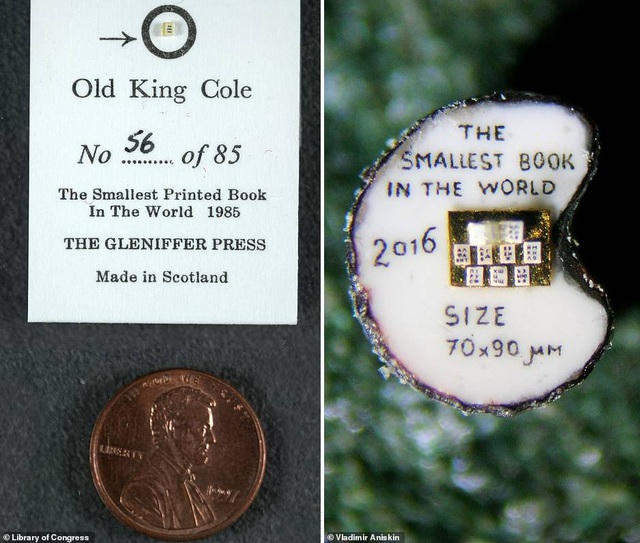 Ảnh trái: Cuốn "Old King Cole" có 12 trang được thực hiện bởi nhà xuất bản Gleniffer Press ở Scotland hồi năm 1985. Cuốn sách có kích thước 1mm x 1mm. Những trang của cuốn sách này chỉ có thể lật giở bằng một cây kim. Ảnh phải: Cuốn sách nhỏ nhất thế giới trong năm 2016 được thực hiện bởi nhà vật lý học người Nga Vladimir Aniskin.