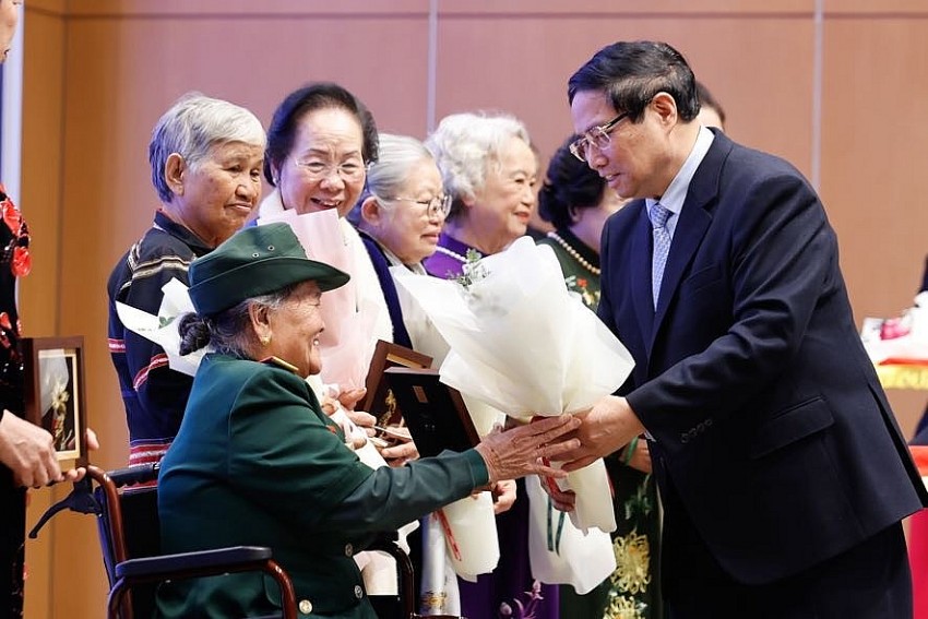 | Thay mặt lãnh đạo Đảng, Nhà nước, Thủ tướng Phạm Minh Chính ghi nhận, đánh giá cao những đóng góp to lớn của các nữ Anh hùng lực lượng vũ trang, nữ Anh hùng lao động, nữ tướng, các nhà khoa học nữ trong suốt thời gian qua - Ảnh: VGP |