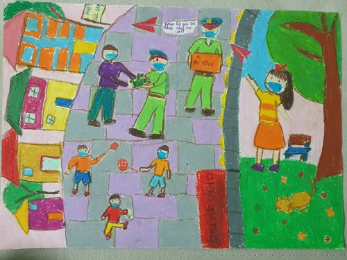 Tranh vẽ: “Bố và đồng đội tiếp thực phẩm cho người dân trong khu cách ly phòng chống dịch Covid-19”. Tác giả: Lê Vũ Thanh Vân - lớp 2D, trường Tiểu học Việt Nam - Cuba. Tác phẩm đoạt giải Nhì cuộc thi “Thông điệp chiến thắng” do Đoàn TNCS Hồ Chí Minh - Hội đồng Đội quận Ba Đình tổ chức tháng 3-2020.
