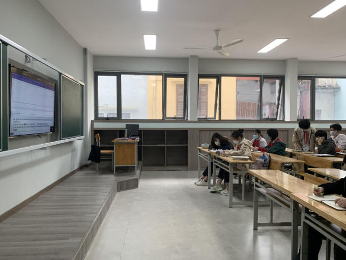 Một lớp học của Trường THCS Chu Văn An (Tây Hồ- Hà Nội) không có giáo viên dạy trực tiếp, tỷ lệ học sinh đi học ít ỏi nhưng vẫn rất nghiêm túc khi học online tại trường. Ảnh: Lê Vân.