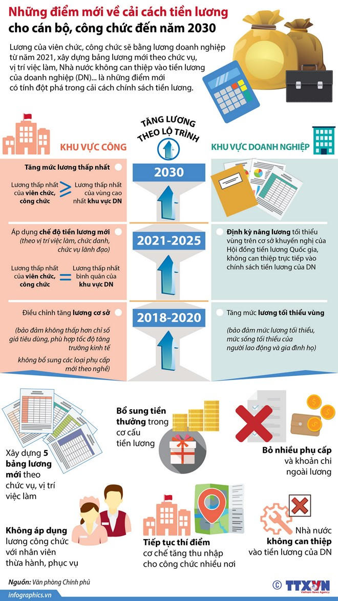 Lương của viên chức, công chức sẽ bằng lương doanh nghiệp từ năm 2021, xây dựng bảng lương mới theo chức vụ, vị trí việc làm, Nhà nước không can thiệp vào tiền lương của doanh nghiệp... là những điểm mới có tính đột phá trong cải cách chính sách tiền lương./.