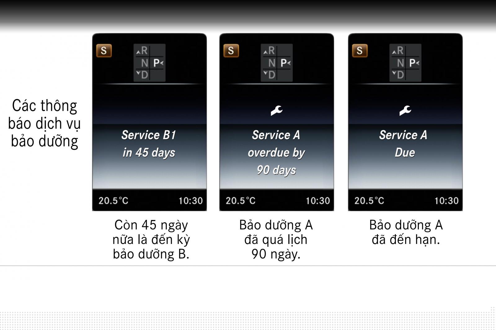 Đây không phải là các cảnh báo lỗi mà là một tính năng được trang bị trên mọi chiếc xe Mercedes-Benz, để nhắc nhở người dùng ngày đến hạn của các đợt bảo dưỡng định kỳ. Bảo dưỡng loại A (Service A) đồng nghĩa với những bảo dưỡng đơn giản có thể thực hiện trong thời gian ngắn, trong khi Bảo dưỡng loại B (Service B) là những bảo dưỡng qui mô hơn.