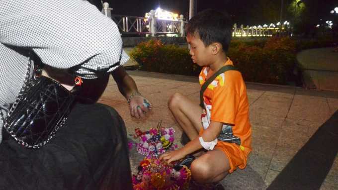Hơn 22h khuya, Minh Chiến (7 tuổi, mồ côi cả cha mẹ) ngồi lặng lẽ bên góc đường tại khu vực Bến Ninh Kiều. Trên tay cầm chuỗi hạt, ai đi qua em cũng chào mời, mong khách mua làm vật kỷ niệm. Đối với em, Tết Trung thu cũng vất vả như ngày thường, thậm chí vất vả, bận rộn hơn do khách đông, em tranh thủ đi bán thêm để kiếm tiền.