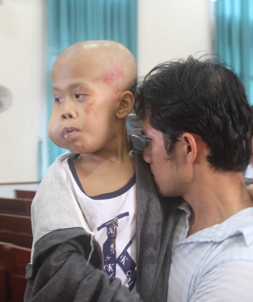 Bé trai 7 tuổi Vũ Anh Dũng ở Bình Phước mắc bệnh ung thư xương. Nửa trái gương mặt sưng to khiến bé nói chuyện khó khăn, miệng luôn chảy nước...