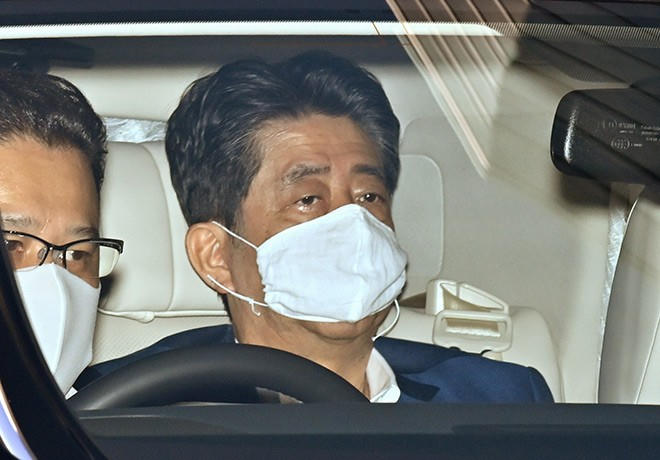 Thủ tướng Nhật Bản Shinzo Abe trong xe ô tô khi được đưa tới bệnh viện ở Tokyo ngày 24/8. Ảnh: Asahi