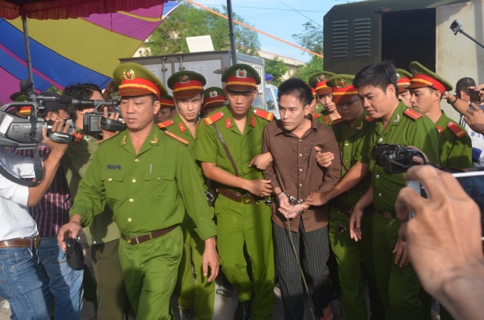 Khoảng 7h15, thân nhân người nhà ôm di ảnh 6 thành viên gia đình ông Lê Văn Mỹ vào dự phiên tòa trong dòng nước mắt ngẹn ngào. Đến 7h30, bước ra từ 2 xe áp tải phạm nhân bước ra, cả ba bị cáo đều không dám ngước mặt lên nhìn. Khuôn mặt ai cũng nhợt nhạt hiển hiện sự sợ sệt, hối lỗi.