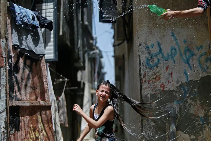Đứa trẻ Palestine chơi đùa với nước vào một ngày nóng nực tại trại tị nạn ở Dải Gaza.