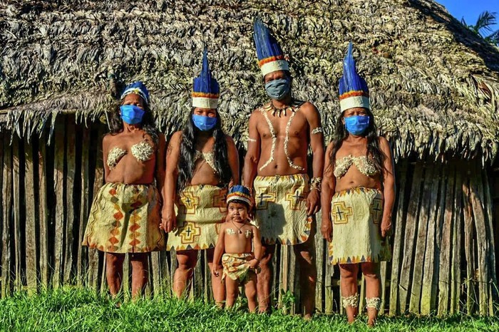Những người da đỏ trong đeo khẩu trang y tế ở Leticia, Colombia.