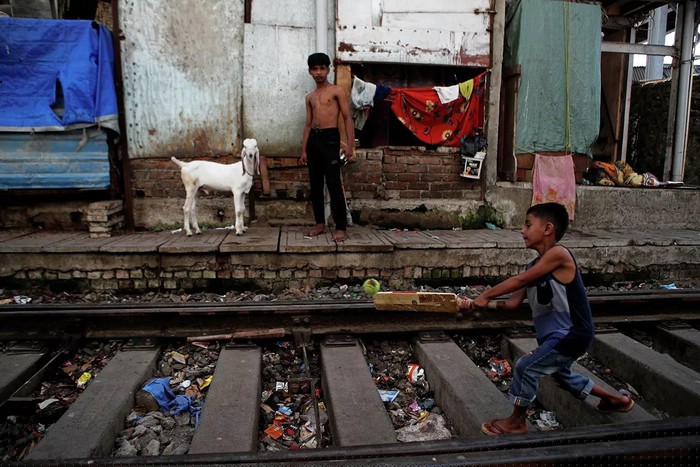 Trẻ em chơi trên đường sắt ở Mumbai.
