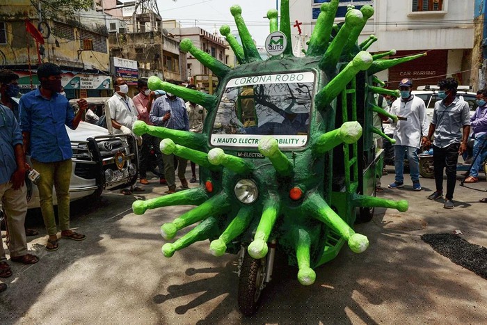 Một nhân viên của thành phố Chennai ở Ấn Độ di chuyển trên chiếc xe có hình virus corona, nhằm tuyên truyền mọi người nâng cao ý thức phòng chống Covid-19.