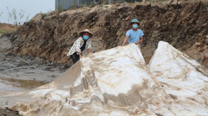 Công nhân trải vải địa kỹ thuật xuống phía dưới nền trước khi đổ cát san lấp.