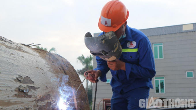 Anh Nguyễn Viết Chiến đang hàn gia cố chắc chắn lại những chỗ hư hỏng của cọc khoan nhồi.