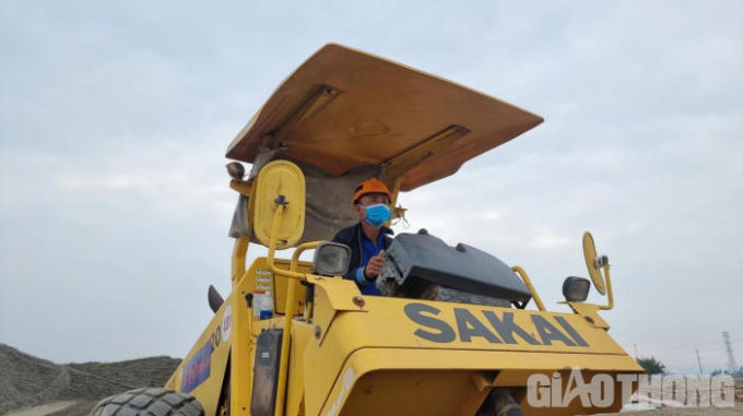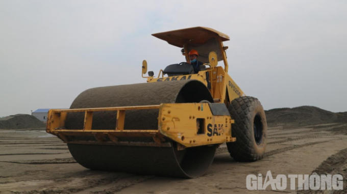 Lái máy đang lu lèn bãi tập kết cát ở gói thầu XL2