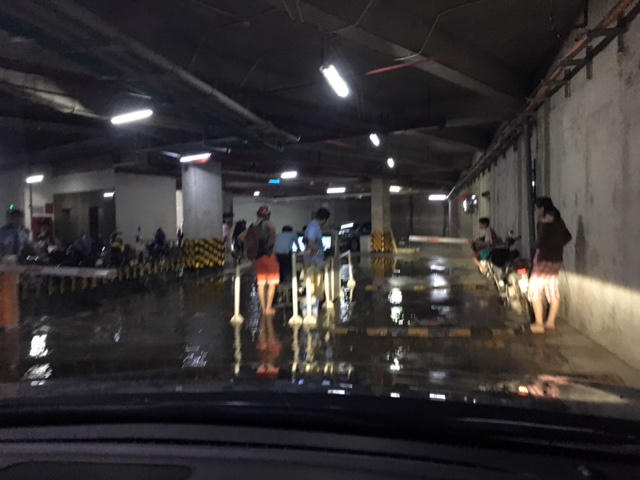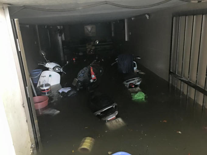 Tại nhiều chung cư nước đã tràn xuống hầm gửi xe. Người dân đã tìm mọi cách để "cứu nguy". Một số chung cư sử dụng những bao tải đất chắn ngang cửa hầm để hạn chế nước chảy xuống hầm xe.