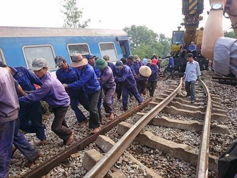 Sáng nay 21/2 lực lượng cứu hộ đã đưa được các toa tàu ra khỏi đường ray, tuy nhiên đường ray cong vênh lớn vẫn đang tiếp tục khắc phục.