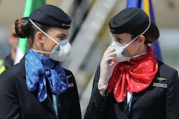 Các tiếp viên hàng không giao tiếp qua khẩu trang tại sân bây Belgrade Nikola Tesla ở Serbia.