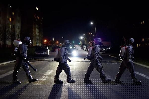 Nhân viên y tế Belarus trong trang phục bộ đồ bảo hộ trên đường đến một bệnh viện gần Minsk.