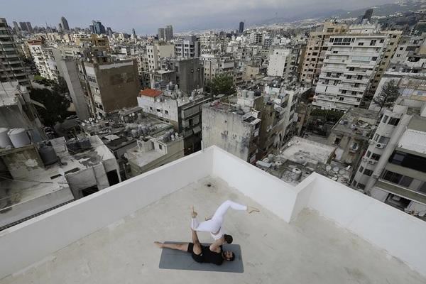 Một huấn luyện viên yoga và vợ đang tập luyện trên nóc một ngôi nhà ở Beirut, Liban.
