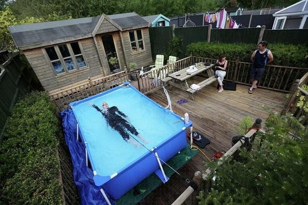 Vận động viên bơi lội đang tập luyện tại một bể bơi tự chế tại nhà.