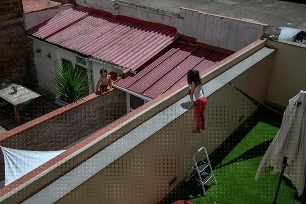 Trẻ em nói chuyện với nhau qua một hàng rào ở Barcelona, Tây Ban Nha.
