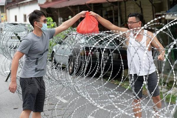 Người đàn ông đưa gói hàng qua bức tường dây thép gai ở Kuala Lumpur, Malaysia trước chế độ cách ly xã hội do dịch Covid-19.