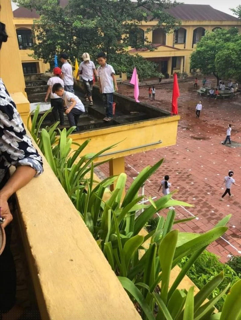 Chưa hết, ngày 11/9, hình ảnh ghi lại cảnh một nhóm học sinh Trường Tiểu học Nghĩa Hưng (huyện Lạng Giang, Bắc Giang) nhặt rác trên ban công tầng 2 được chia sẻ nhiều trên mạng xã hội.