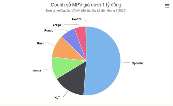 Sự áp đảo của Mistubishi Xpander trong nhóm xe gia đình 7 chỗ đã được nhắc đến nhiều trong thời gian qua. Mẫu xe của Mitsubishi tăng thị phần từ mức 49% trong 7 tháng 2020 lên 51% vào cùng kỳ 2021.