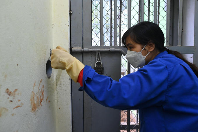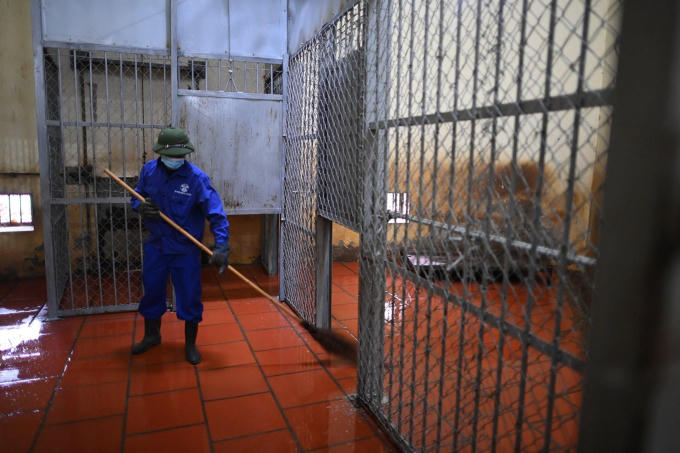 Do tình hình dịch Covid-19 diễn biến phức tạp tại Hà Nội, những ngày gần Tết khi vườn thú bắt đầu mở cửa đón khách trở lại, nhân viên chăm sóc hổ phải làm thêm công việc khử trùng toàn bộ khu vực bên trong cho đến khi chuồng khô ráo.