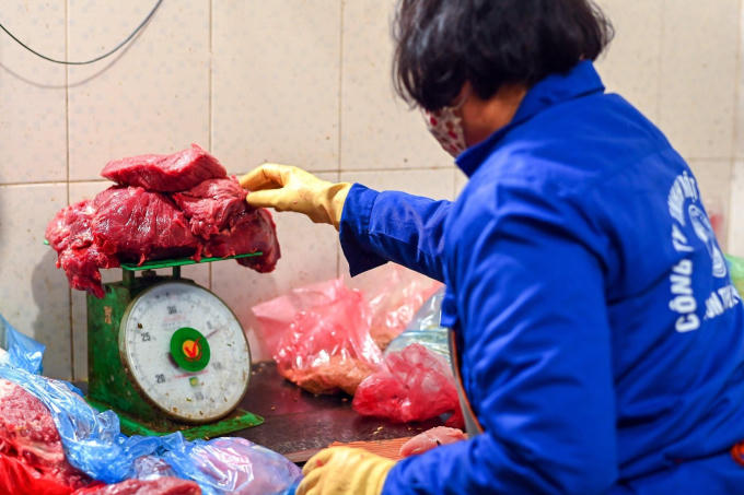 Đến 9h30 cùng ngày, các công nhân chuẩn bị thức ăn cho đàn hổ. Thông thường, tiêu chuẩn dành cho mỗi cá thể hổ là 5 kg thịt và 1 kg sườn.