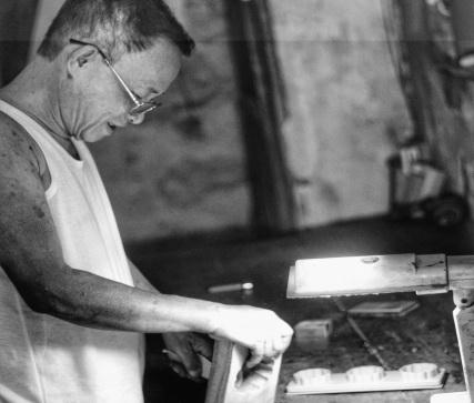 Ông Quang gắn bó với nghề làm khuôn bánh trưng ở phố hàng Quạt đã hơn nửa đời người.