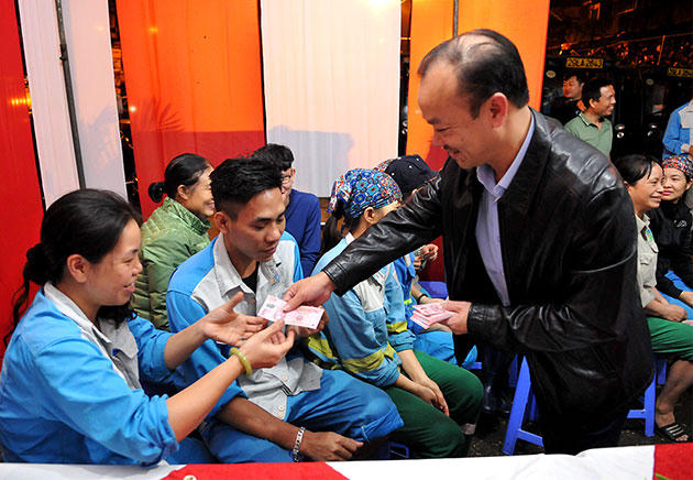 Lãnh đạo Công ty TNHH Một thành viên Môi trường đô thị Hà Nội lì xì cho các công nhân làm việc đêm giao thừa.