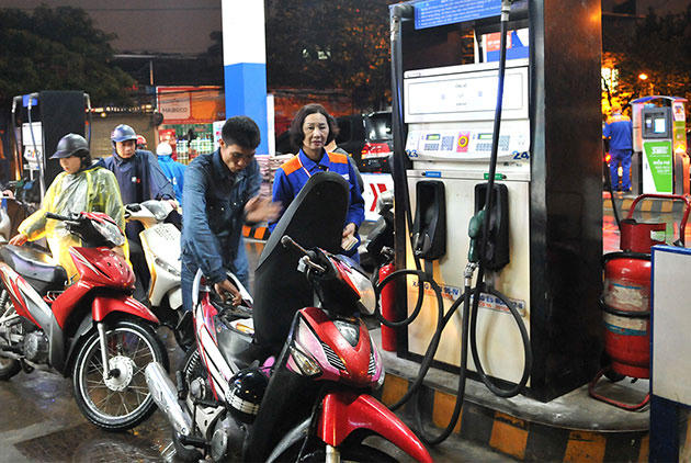 Nhân viên cây xăng trên phố Lương Yên (Hà Nội) phục vụ khách đêm giao thừa.