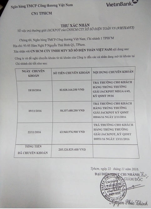 Để chứng minh về việc đã trả thưởng cho các khách hàng trúng thưởng các kỳ quay số mở thưởng số 39, 46 và 51, Vietlott đã yêu cầu Ngân hàng TMCP Công thương Việt Nam (VietinBank) - Chi nhánh 1 TPHCM phát hành thư xác nhận về việc trả thưởng giải Jackpot của Công ty Xổ số điện toán Việt Nam Chi nhánh Hồ Chí Minh (số tiền trả thưởng sau khi khấu trừ thuế TNCN theo quy định của pháp luật).