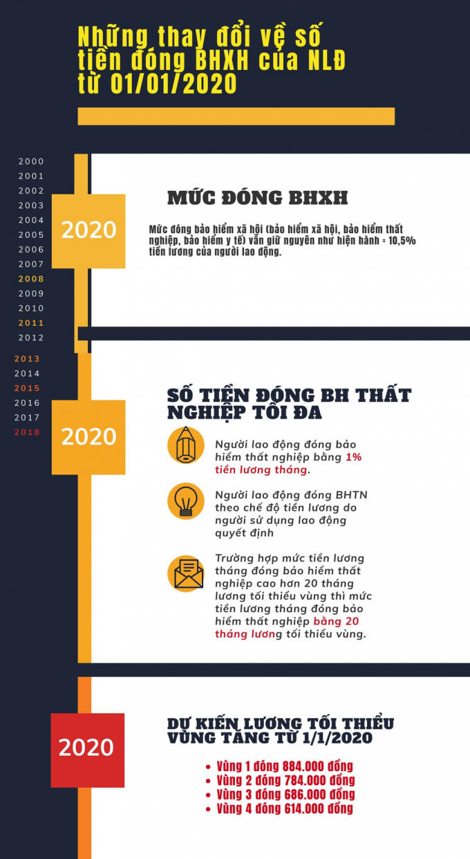 Mức đóng bảo hiểm xã hội vẫn giữ nguyên như hiện hành. Số tiền đóng bảo hiểm thất nghiệp tối đa có sự thay đổi từ ngày 01/01/2020
