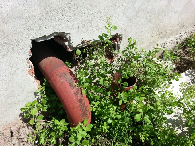 | Ống nước bị cỏ cây mọc che lấp, hoen rỉ. |