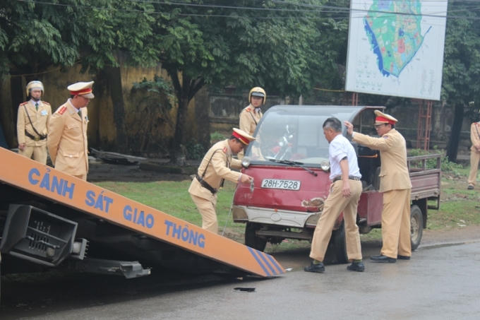 Từ 8h sáng, Đội Nội tỉnh thuộc Phòng Cảnh sát giao thông (CSGT) Công an tỉnh Ninh Bình bắt đầu trển khai lực lượng đến thị trấn Nho Quan (huyện Nho Quan) phối hợp cùng với lực lượng giao thông của huyện này truy bắt những chiếc xe ba gác, xe kéo, xe tự chế không đảm bảo các chỉ số an toàn.