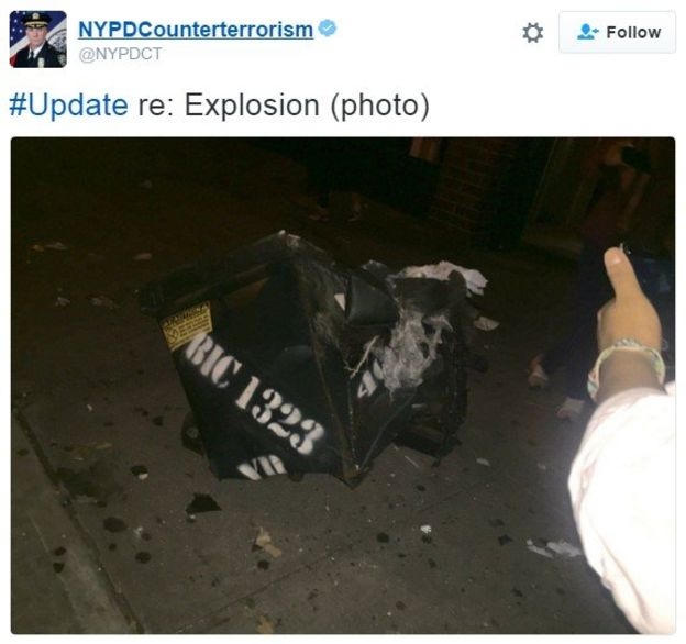 Theo báo cáo của lực lượng chống khủng bố NewYork, quả bom đã phát nổ từ một thùng rác lớn và khiến cửa sổ của tòa nhà 14 tầng gần đó vỡ vụn.