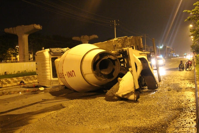 Tại hiện trường, biển báo giao thông bị tông gãy, hơn 10m giải phân cách bị húc văng, chiếc xe bồn lật ngang chắn hết làn ô tô trên xa lộ Hà Nội,trục bánh trước gãy rời văng ra ngoài, bê tông đổ tràn ra đường, chiếc xe bồn bị hư hỏng nặng. Rất may tài xế chỉ trày xướt nhẹ.