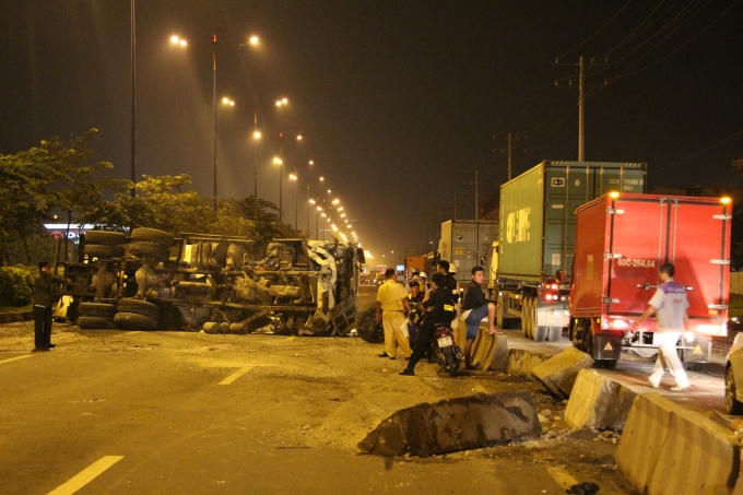 Theo đó, khoảng 0h40 phút xe bồn BKS 61LD-025.64 chạy trên xa lộ Hà Nội hướng Suối Tiên đi cầu Sài Gòn. Khi vừa qua khỏi ngã tư Thủ Đức khoảng 300m (phường Trường Thọ, quận Thủ Đức, TP HCM) thì bất ngờ nổ lốp khiến xe chao đảo tông vào biển báo giao thông và húc văng giải phân cách rồi lật ngang xuống đường.