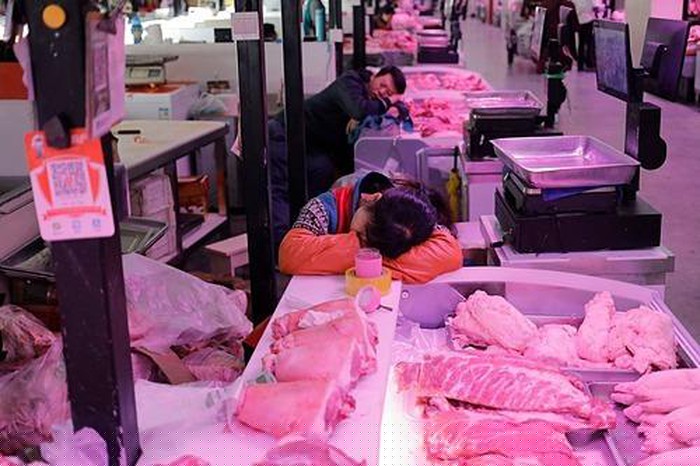 Người bán thịt heo tại Bắc Kinh chợp mắt trong lúc chờ khách vào tháng 10/2019. Ảnh: Wu Hong