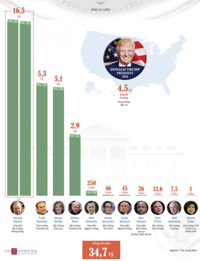 Tổng thống Mỹ đắc cử Donald Trump đưa hàng loạt tỷ phú và triệu phú với tổng tài sản gần 35 tỷ USD vào nội các mới.