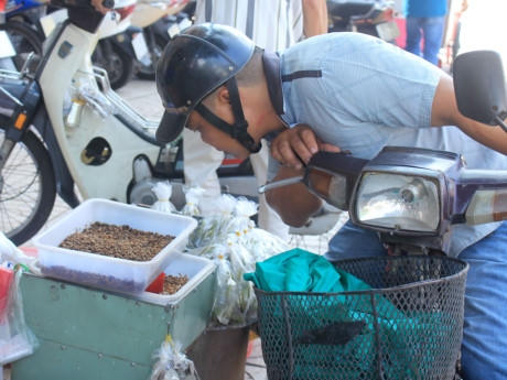 Ông Nguyễn Văn Sâm (ngụ quận 8) cũng chia sẻ: “Nhà ngay đây nên tui cũng trở thành khách quen của mấy người bán ở đây luôn. Một bịch dế có 5.000 đồng, mỗi lần mua là tui lại mang lọ ra đựng để mua cho nhiều luôn”.
