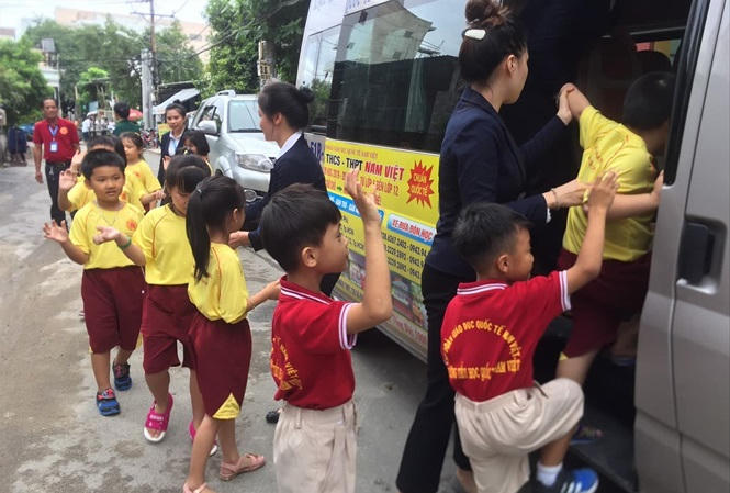 Học sinh lên xe đưa đón của Trường THCS - THPT Quốc tế Nam Việt