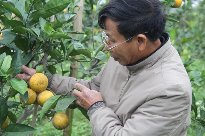 Sáng sớm, ông Phan Công Hưởng (trú xóm 8, xã Nghi Diên, huyện Nghi Lộc, Nghệ An) lại vội vã vào thăm vườn cam Xã Đoài của mình để kiểm tra tình trạng sâu bệnh.