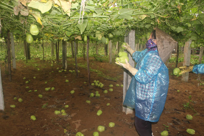 Dù không bán được, nhưng nhiều hộ trồng su su phải thuê người để hái bớt quả để không làm hỏng giàn.