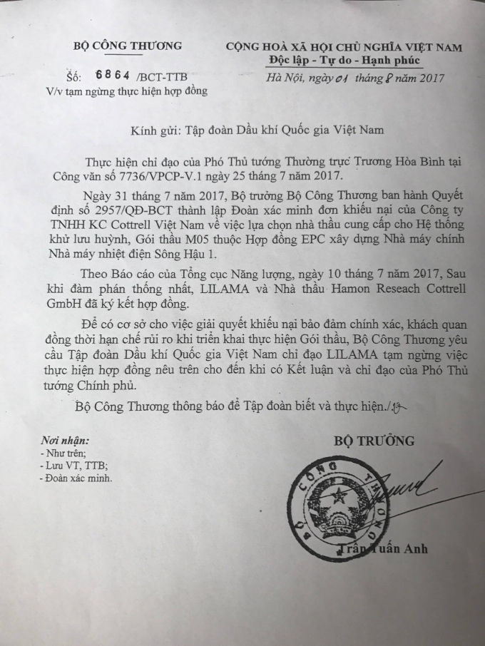 Theo đó, ngày 31/7, Bộ trưởng Công thương ban hành quyết định số 2957/QĐ-BCT thành lập đoàn xác minh khiếu nại về lựa chọn nhà thầu cung cấp cho hệ thống khử lưu huỳnh, gói thầu M05 thuộc hợp đồng xây dựng nhà máy chính Nhà máy nhiệt điện Sông Hậu 1.