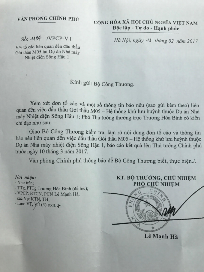 Văn bản cũng nêu rõ, về việc này, Phó Thủ tướng thường trực Chính phủ Trương Hòa Bình giao Bộ Công thương kiểm tra, làm rõ nội dung tố cáo và thông tin báo chí nêu liên quan đến gói thầu M05. Đồng thời, Bộ Công thương có trách nhiệm báo cáo kết quả lên Thủ tướng Chính Phủ trước ngày 10 tháng 3 năm 2017.
