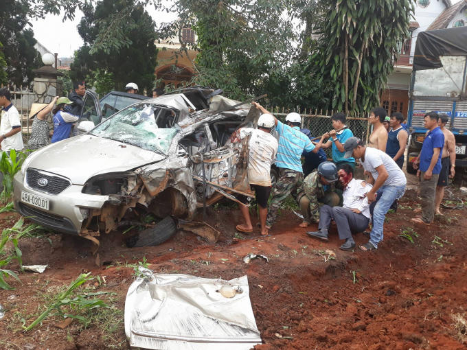 Cú tông mạnh, làm cả 2 xe đều văng vào lề đường, khiến một người tử vong tại chỗ, 4 người đi trên xe ô tô con bị thương nặng đang được người dân nhanh chóng đưa đi bệnh viện cấp cứu. Tại hiện trường, Chiếc xe con nát hết một bên thân và đầu.