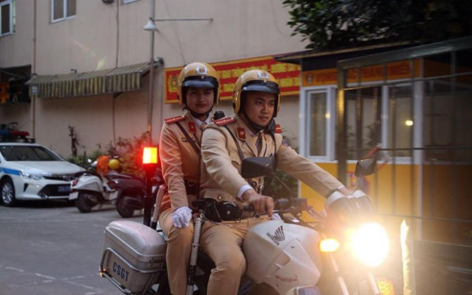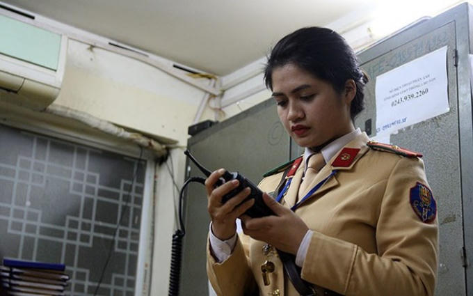 Sau khi giao ban tại đơn vị, Thiếu úy Nguyễn Châu Linh, chiến sĩ đội cảnh sát giao thông số 3 (Phòng CSGT Hà Nội) ra bốt thực hiện nhiệm vụ hỗ trợ phân làn, điều tiết phương tiện giao thông giờ cao điểm tại nút giao Nguyễn Chí Thanh – Huỳnh Thúc Kháng.