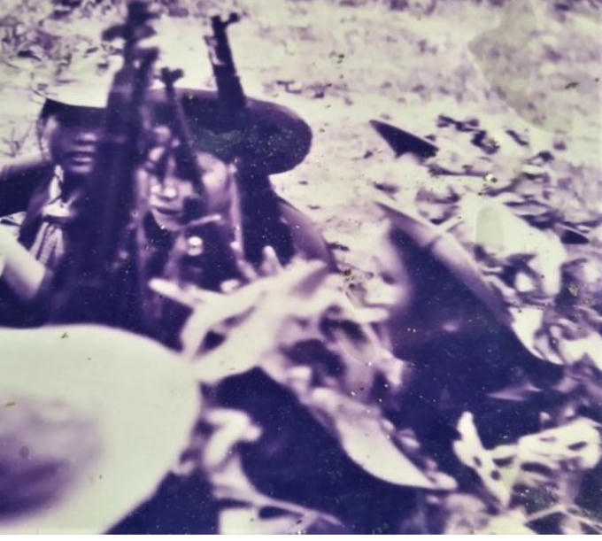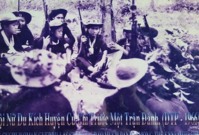 Bức ảnh lịch sử chụp Trung đội nữ du kích Củ Chi năm 1966. Chị Lê Thị Sương cầm súng bắn tỉa ngồi quay lưng.